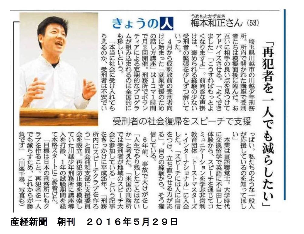 2016年5月29日(日) / 最終更新日時 : 2019年7月14日(日) Nakamura Takaya 産経新聞『きょうの人』にて掲載 産経新聞 朝刊 2016年5月29日 に代表 梅本和正を取り上げていただきました。 あなたも参加してみませんか?あなたも当団体で、私たちの活動に参加しませんか? 上記活動に限らず「こんなことをしてみたい!」というアイデアも大歓迎です。 お気軽にお問合せください。 お問い合わせフォームへFacebookXBlueskyHatenaCopy